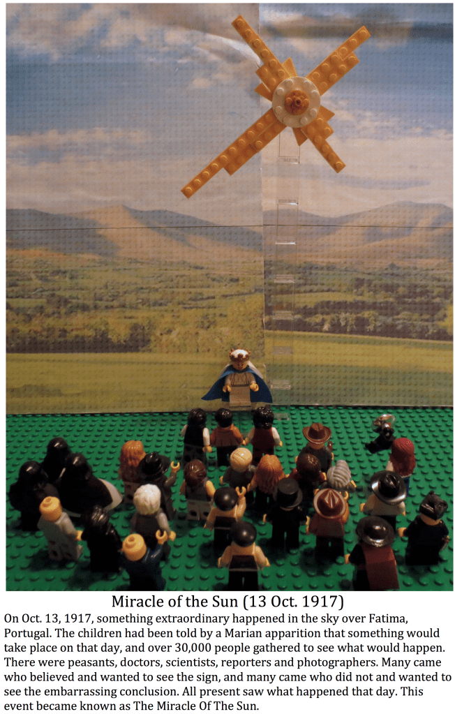 It’s important to remember as well that there was a miracle predicted for noon, but it was never said it would involve the sun or be in the sky, so nobody would have had a reason to be watching for it who was not present in the crowd when the word went out saying, “Look at the sun!” Also, the miracle happened at 1:30, but Portugal turned the clocks an hour forward on account of the war by an hour and a half, so it did occur at proper (solar) noon even though it was late by people’s watches.