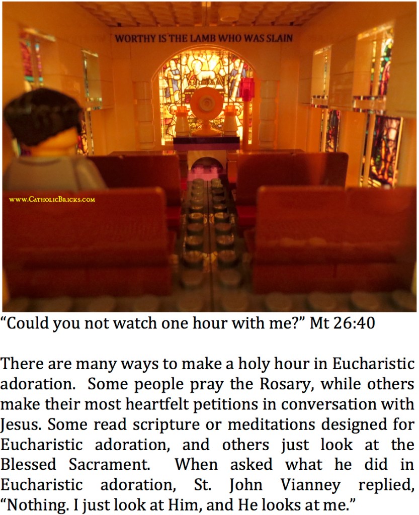 Making a holy hour in Eucharistic adoration “Could you not watch one hour with me?” Mt 26:40 There are many ways to make a holy hour in Eucharistic adoration. Some people pray the Rosary, while others make their most heartfelt petitions in conversation with Jesus. Some read scripture or meditations designed for Eucharistic adoration, and others just look at the Blessed Sacrament. When asked what he did in Eucharistic adoration, St. John Vianney replied, “Nothing. I just look at Him, and He looks at me.”